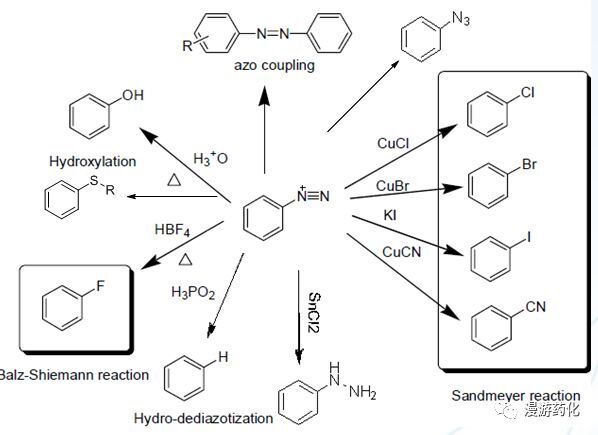 1935 年,F(xiàn).B.Dains和 F.Eberly用KI去處理重氮鹽,成功合成了碘代苯。隨后重氮化羥基取代和重氮化去胺反應(yīng)也相繼被發(fā)現(xiàn),加上偶氮反應(yīng),形成了比較完善的芳香重氮化合物反應(yīng)體系。
