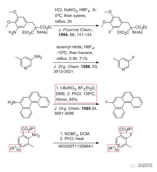 1927 年,同樣是德國的化學(xué)家G.Balz和G.Schiemann發(fā)現(xiàn)直接加熱苯胺的硼氟酸重氮鹽能得到氟苯,這就是Balz-Schiemann反應(yīng)。